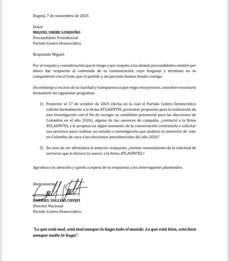 El 17 de octubre de 2025, el Centro Democrático envió una solicitud formal a la firma Atlas Intel para que presentara una propuesta de medición que ayudara a definir quién sería su candidato presidencial para 2026. Todo parecía rutinario hasta que, al parecer días después, asesores de la campaña de Miguel Uribe contactaron directamente a la encuestadora, por fuera de los canales oficiales, para pedir una cotización paralela.