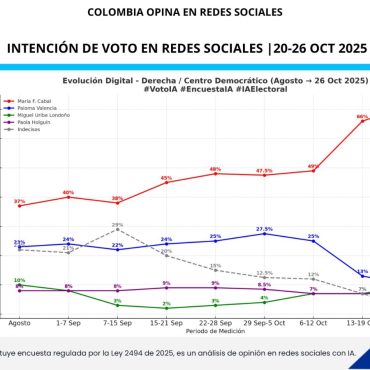 Una nueva medición de IAelectoral revela que la precandidata presidencial domina la intención de voto digital del uribismo, mientras Paloma Valencia cae a su punto más bajo y los indecisos […]